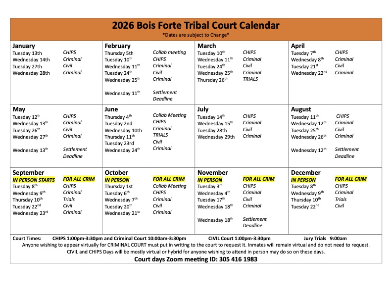The Bois Forte Tribal Court provides for due process of criminal matters for all persons within the jurisdiction of the Bois Forte Reservation. Bois Forte Band maintains its own Tribal Courts that provides both criminal and civil services for the band members. The Tribal Courts hear all misdemeanor and gross misdemeanor cases resulting from violations of the Tribal Code. Certain felony crimes are adjudicated in federal court. Traffic citations are also settled within the courts.